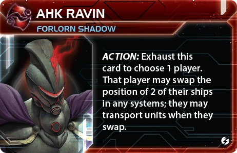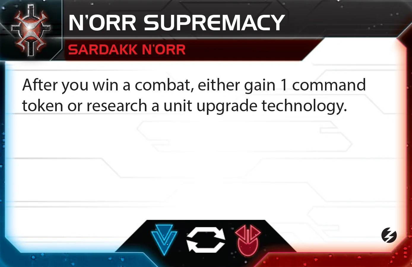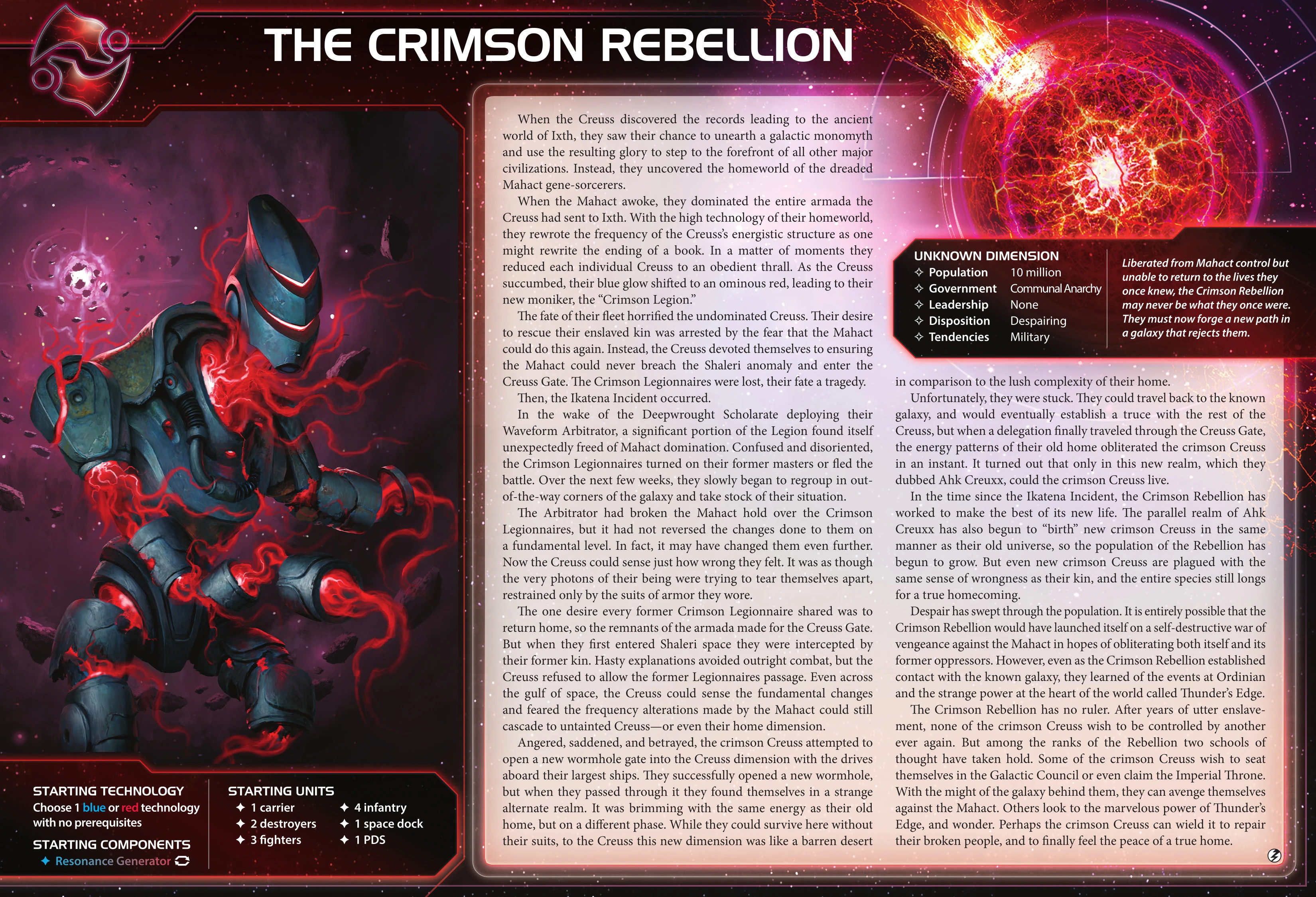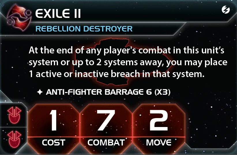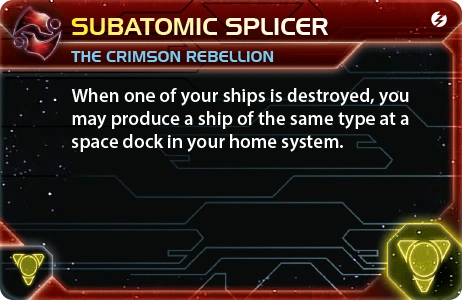 The Crimson Rebellion | Ahk Creuxx | 4 | 2 | 2 | Choose one blue or red technology that has no pre-requisites. | - | 1 | 4 | Destroyer | Subatomic Splicer | |||