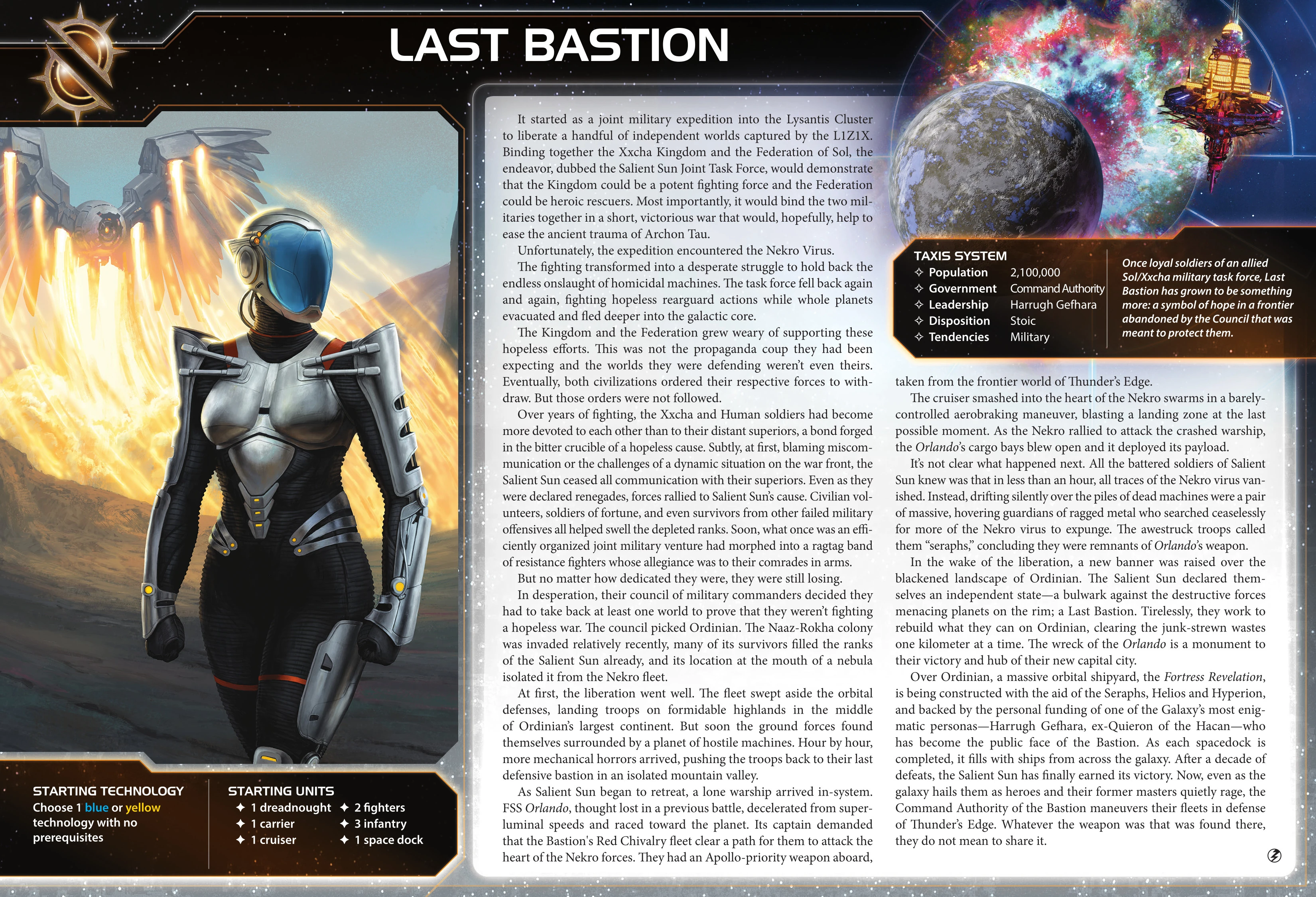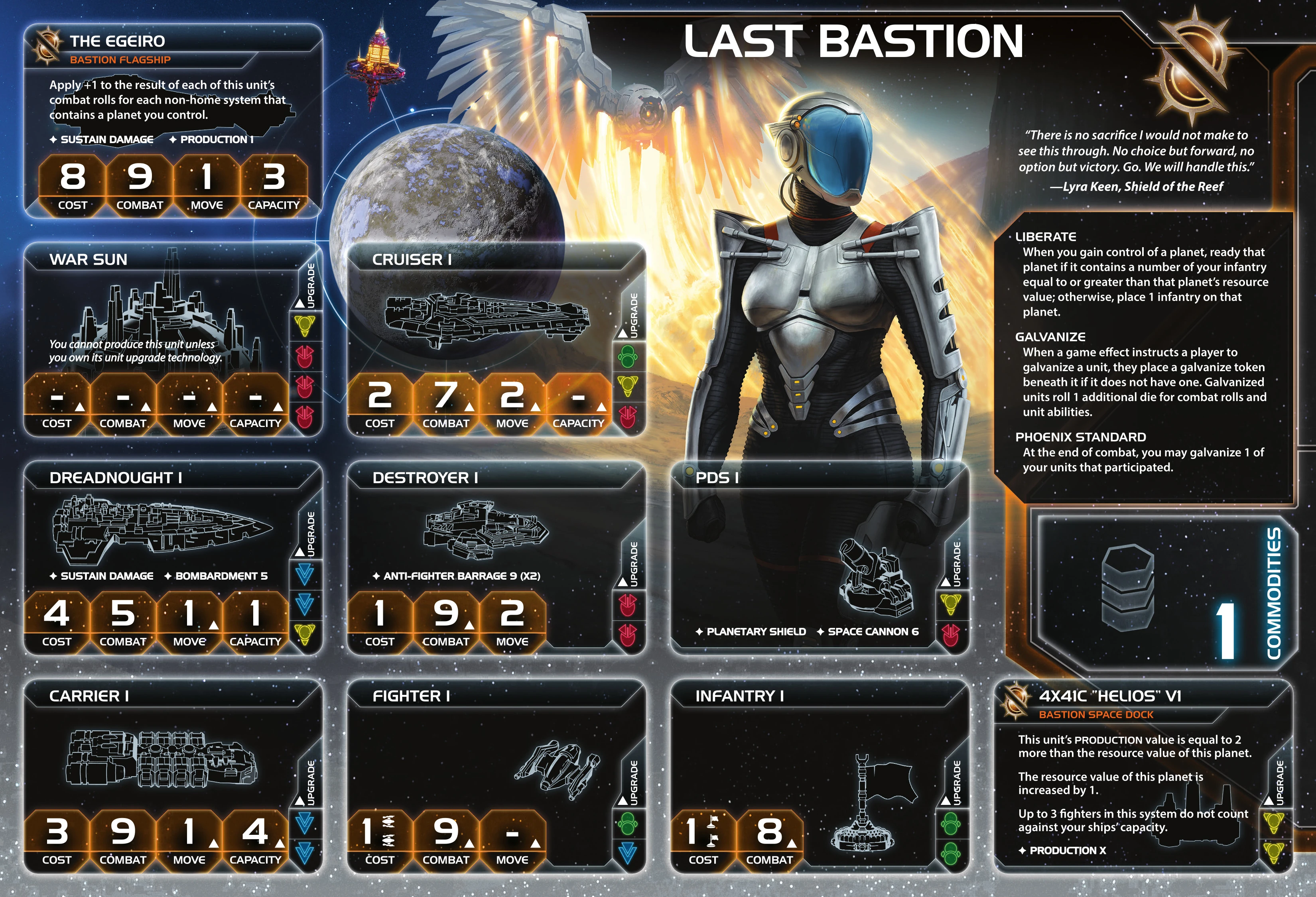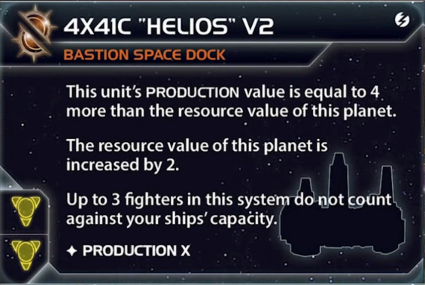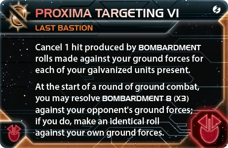 | Last Bastion | Ordinian | 0* | 0 | 1 | Choose 1 blue or yellow technology with no prerequisites | - | 2 | 3 | Space Dock | Proxima Targeting VI | ||||