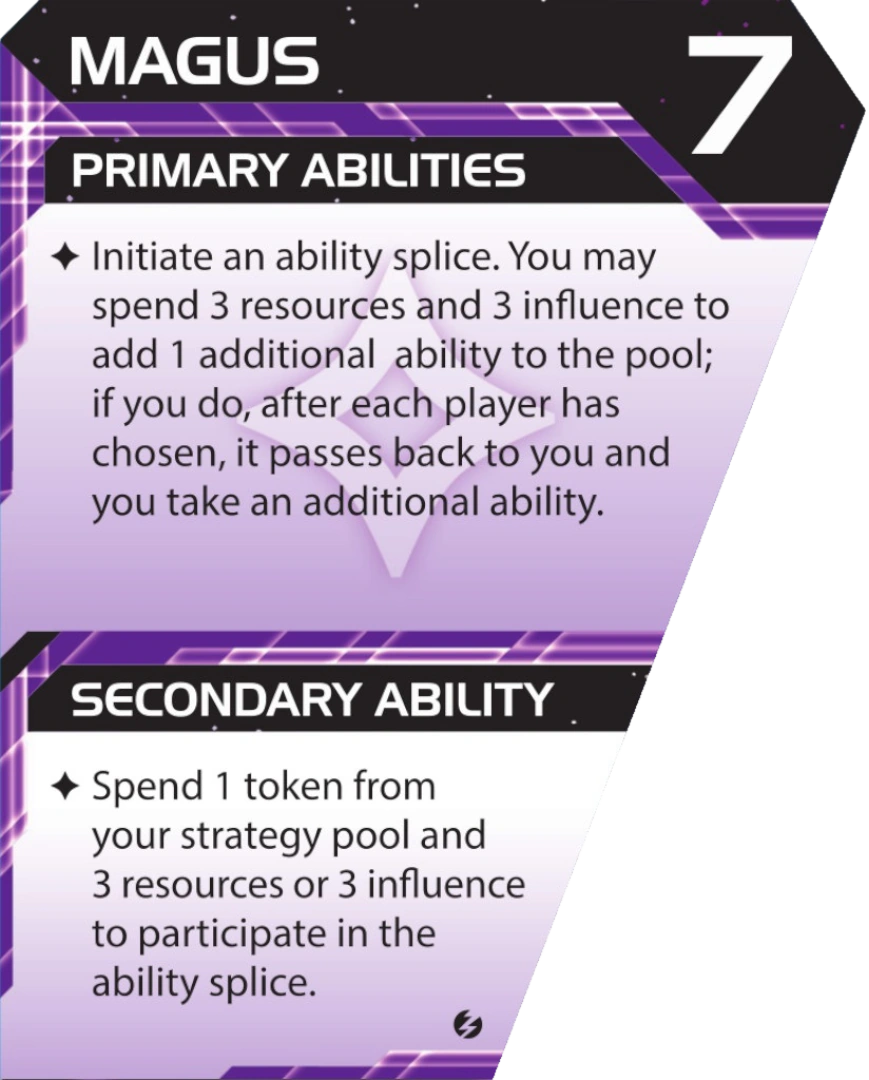 - Initiate an ability splice. You may spend 3 resources and 3 influence to add 1 additional ability to the pool; if you do, after each player has chosen, it passes back to you and you take an additional ability.
