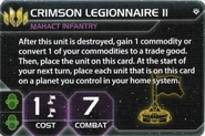 | Crimson Legionnaire II | 1x2 | 7 | After this unit is destroyed, gain 1 commodity or convert 1 of your commodities to a trade good. Then, place the unit on this card. At the start of your next turn, place each unit that is on this card on a planet you control in your home system. |
